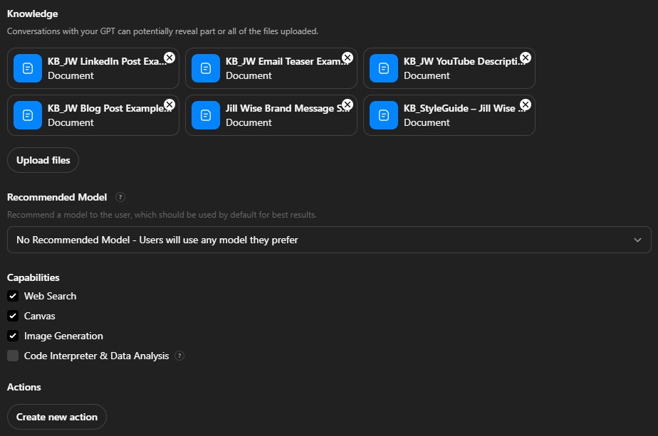 This is where most people either overdo it or underdo it. When deciding how to build a custom GPT that fits your business, you need to consider the information your new GPT will need. Give it just enough. Not too little that it can’t do the job required. Not so much that it gets confused.